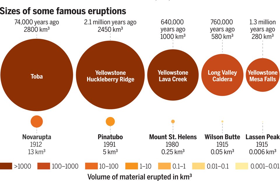 I recall photos of Washington state’s Mount St. Helens’ eruption in 1980. By comparison with supervolcanos, Mount St. Helens was a mere twitch of the Earth’s mantle.