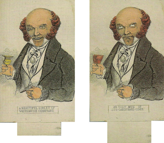 The Whigs transformed hard cider into praise and added it to the slogan “Tippecanoe and Tyler too.” Harrison became “the log cabin and hard cider candidate,” a man of the common people. By contrast, they said, “Martin Van Ruin” was a wealthy snob, out of touch with the American public.