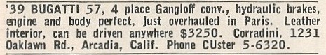 Old R&T “Market Place” classifieds were and, for that matter, still are great places to dream. This Bugatti Type 57, with Gangloff body, may be a sibling of the one that appeared in R&T, November 1953, and was featured in a Time Capsule here at SimanaitisSays.