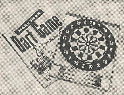 The Marksman Dart Game came directly from England, its dartboard double-sided for English “20-Point” and “Bullseye” games. The Kwiz Minidarts were solid brass with Sheffield Steel points.
