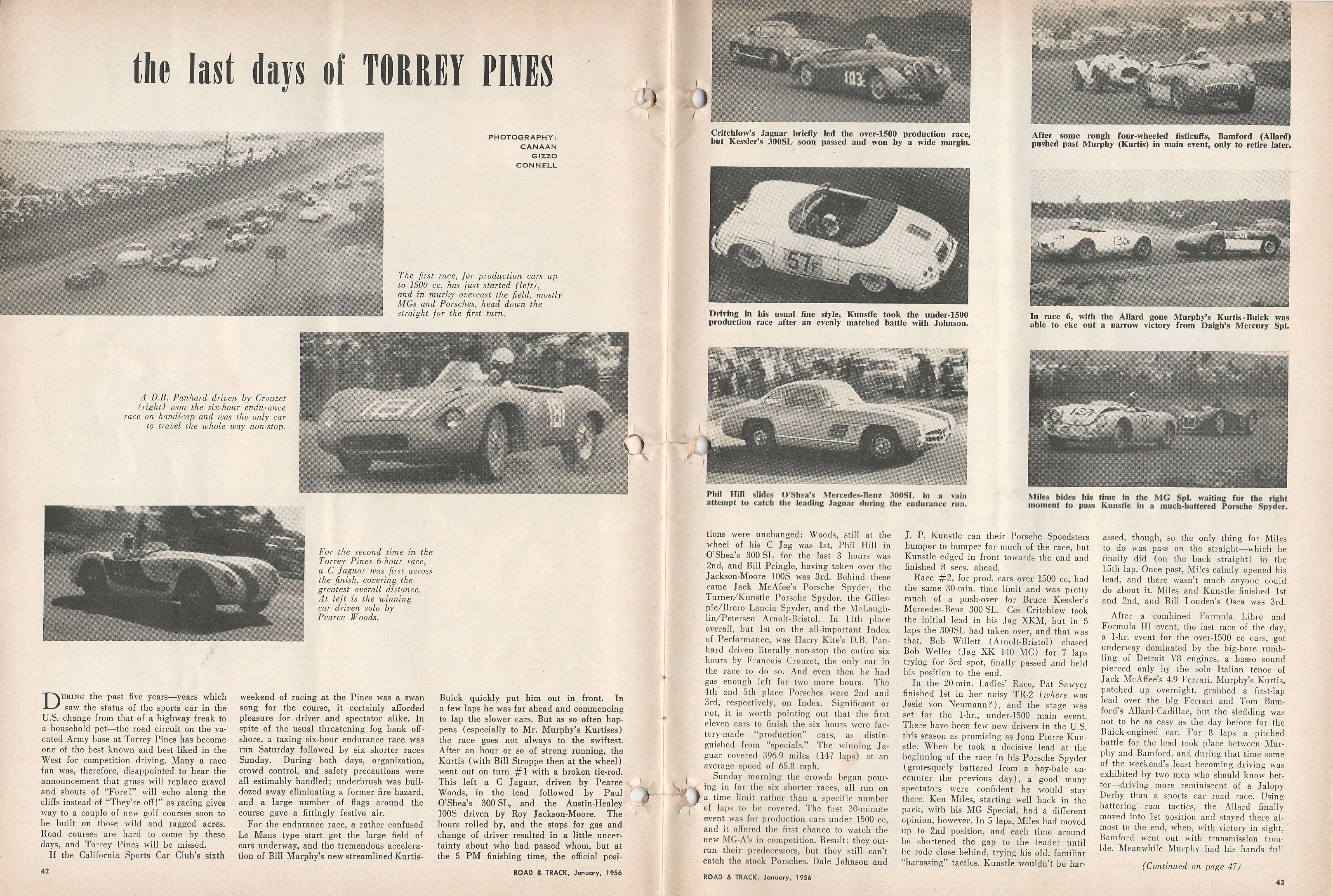 Torrey Pines, a north-coast suburb of San Diego, was known for its California Sports Car Club races in the 1950s. Entrants included Phil Hill driving a gullwing Mercedes-Benz 300SL, Chuck Daigh (later in Lance Reventlow’s Scarab Formula One effort) in the Trout-Barnes Special and Ken Miles (later part of Ford’s successful Le Mans program) in the second of his potent MG Specials.