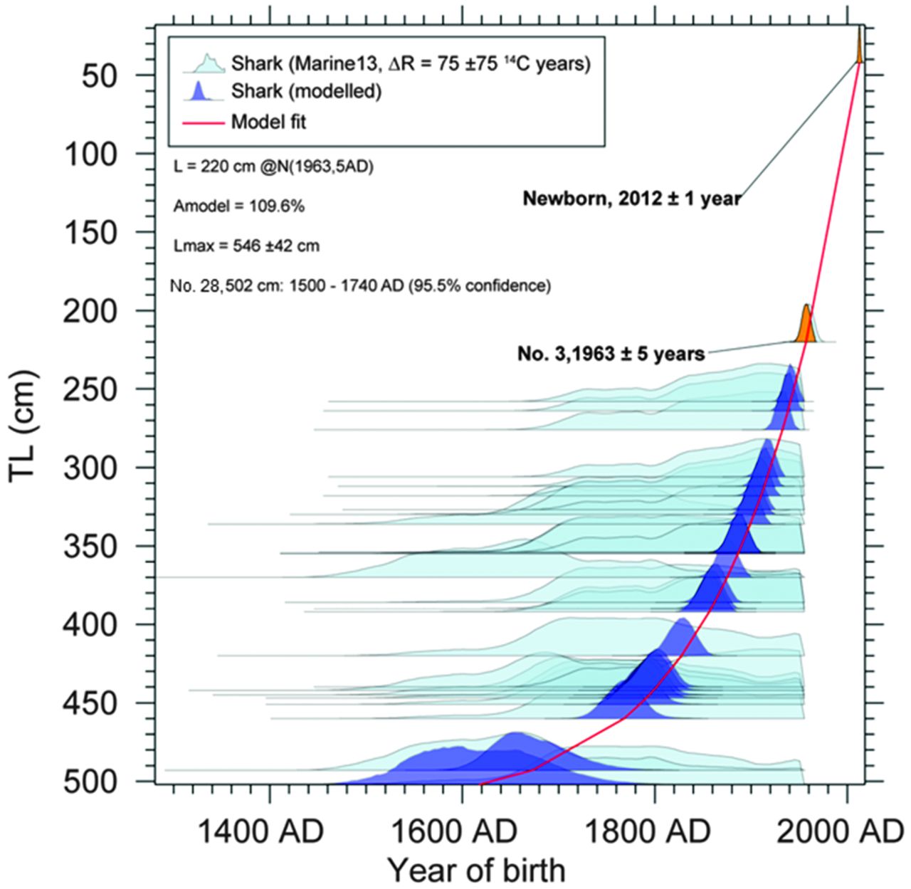 A first attempt was through analyses of backbone bits collected from sharks captured, typically in nets set for other fish, in the North Atlantic. However, no “growth rings” in the bones were discovered. Then researchers turned to radiocarbon dating.