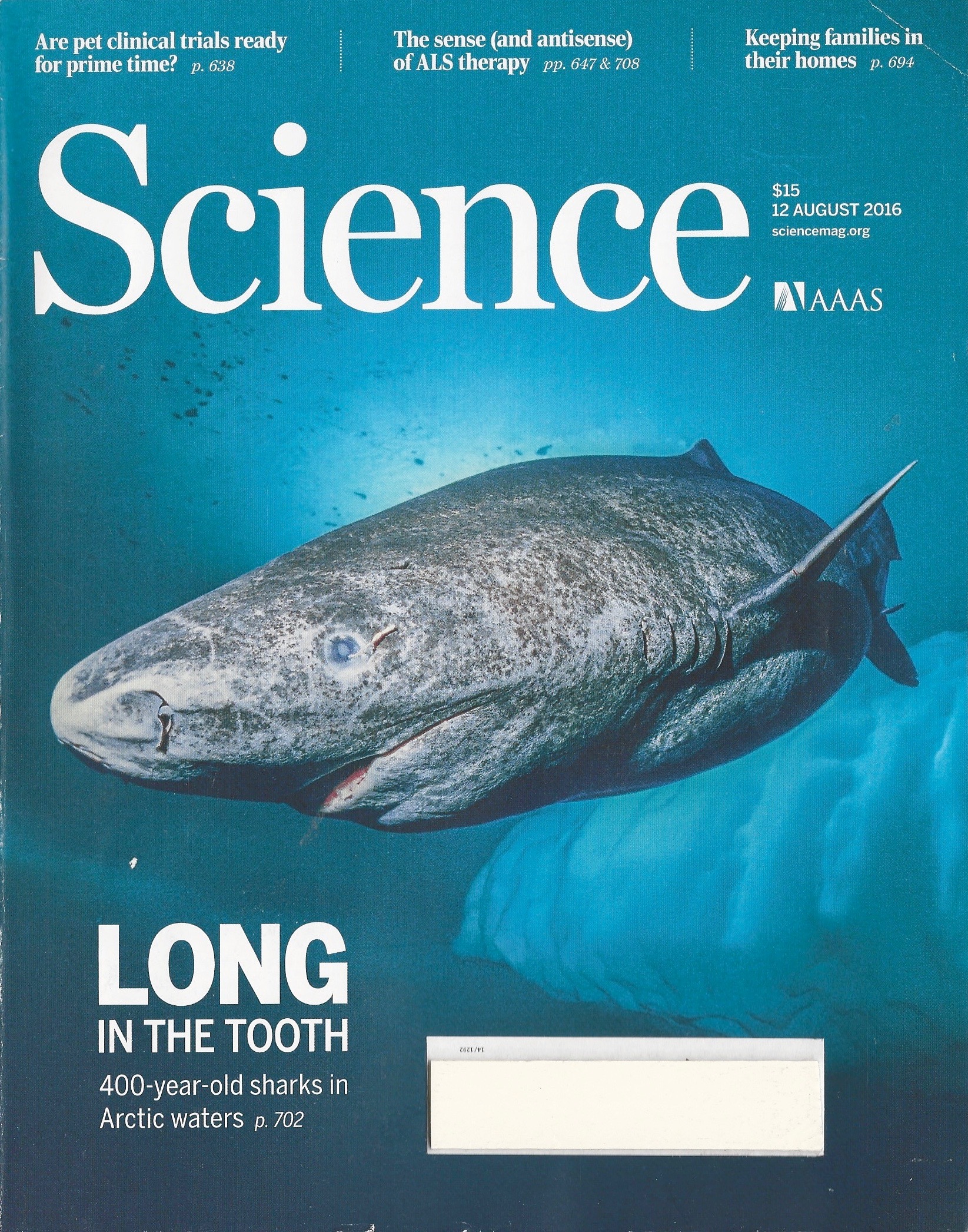 “Eye Lens Radiocarbon Reveals Centuries of Longevity in the Greenland Shark (Somniosus microcephalus),” by Julius Nielsen et al, Science, August 12, 2016, is the technical paper, with a freely available abstract. “Greenland Shark May Live 400 Years, Smashing Longevity Record,” by Elizabeth Pennisi, is a summary article at sciencemag.org. Here are some tidbits.
