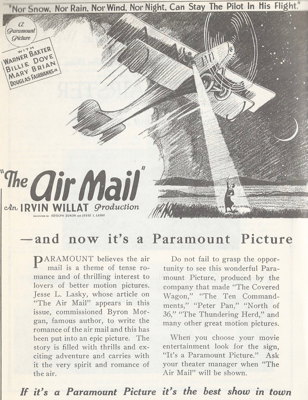 The Air Mail was a Paramount Pictures production, still silent in 1925. Its ad in the Aeroplane Scrap Book says, “Paramount believes the air mail is a theme of tense romance and of thrilling interest to lovers of better motion pictures…. Ask your theater manager when ‘The Air Mail’ will be shown.”