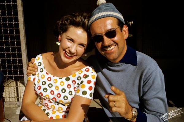 Joan Updike Cahier, California-born spouse of Bernard Cahier, with race driver and family friend Maurice Trintignant, 1955. Image from autonewsinfo.com.