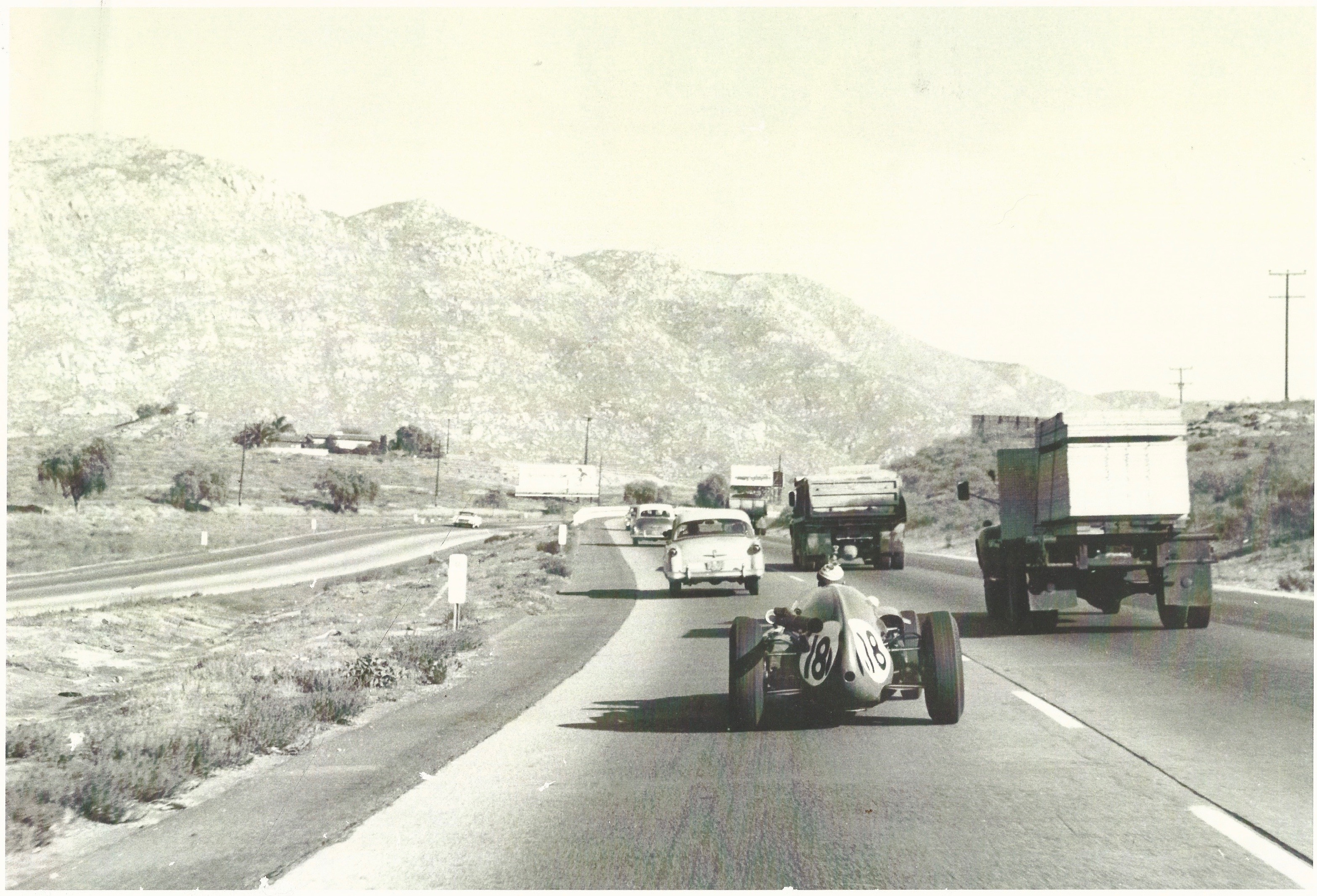 Imagine Maurice Trintignant and his No. 18 Cooper-Maserati motoring along on the Riverside Freeway! The Raceway is long gone (it closed in 1989), and plenty of Riverside has changed. But commuters today would recognize where this Formula One car mixed it up with freeway traffic. ds