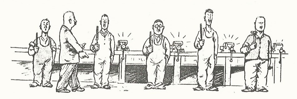 Inspection time at Molsheim. Sketch by English motoring journalist/racing driver S.C.H. Davis. This and the following image from Bugatti Magnum.