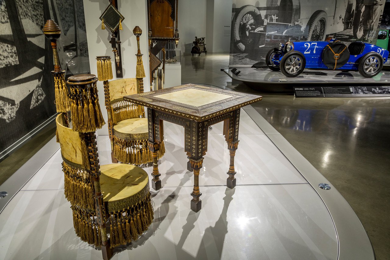 Ettore’s contribution is rolling art in the automobiles fabricated at his Molsheim, Alsace, factory. A striking example in the Petersen exhibit is a Type 57SC Atlantic, its bodywork designed by son Jean. The exposed riveted seams are dictated by the car’s bodywork of Elektron, a magnesium alloy.
