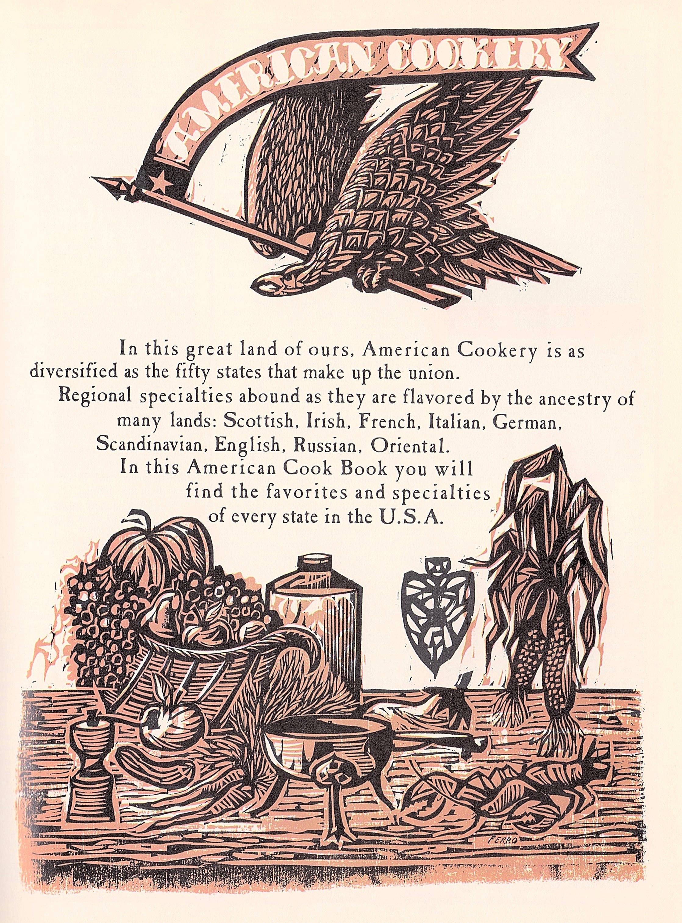 The section on American Cookery offers 58 pages of recipes arranged by state, from Alabama Okra Soup to Wyoming Cheyenne Chocolate Cake.