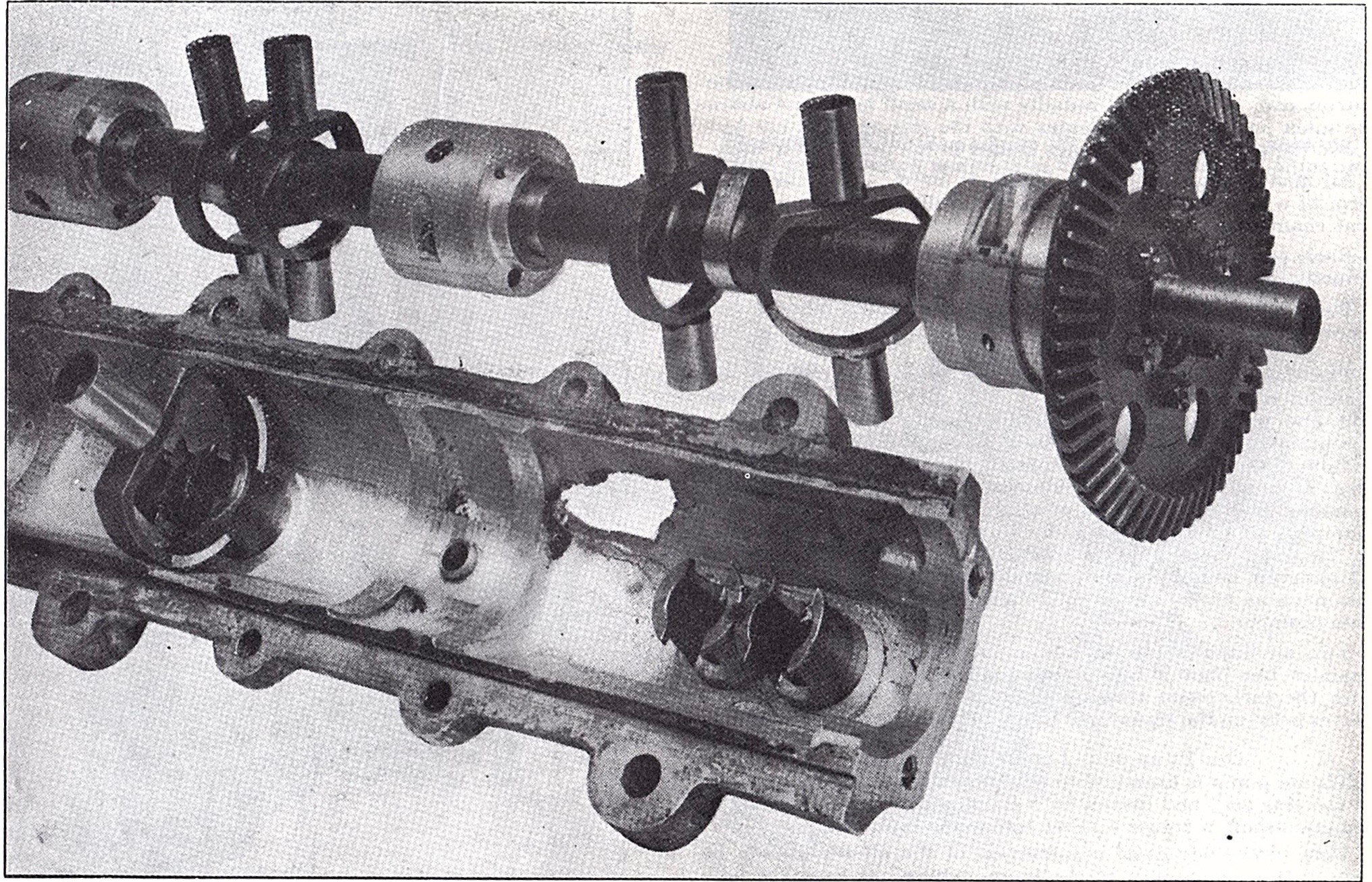 Each tappet is in the shape of a stirrup encircling its cam lobe, with these stirrups riding vertically on bronze bushings. It’s not recorded why this peculiar tappet design was chosen.