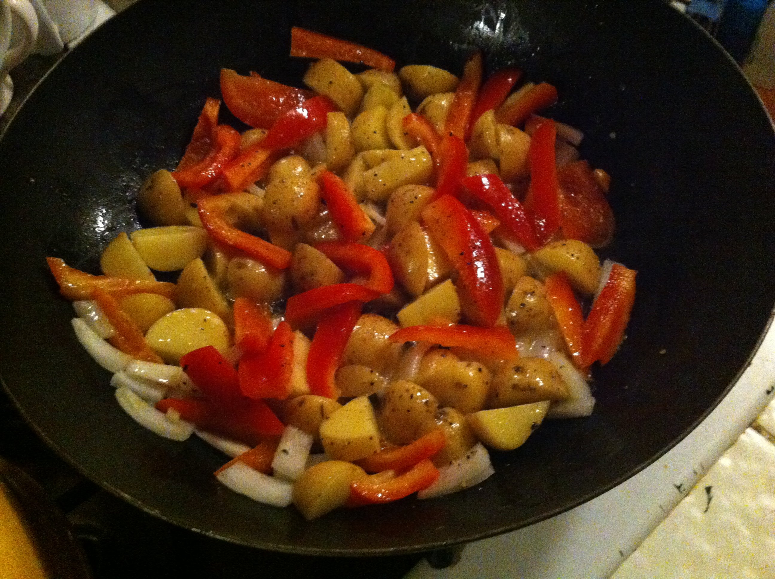 The potatoes, onion and bell pepper go into the wok’s hot butter and olive oil first. They’re stir-fried until the onion becomes transparent and the potatoes brown here and there.