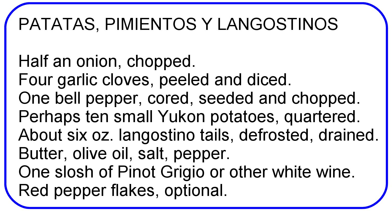 HERE IN THE U.S., the Spanish word langostino describes the squat lobster. It’s neither prawn, nor shrimp, nor a lobster, actually closer to the hermit crab. But our local Trader Joe’s has Chilean wild-caught Langostino Tails that we sure enjoy. Here’s my recipe for sauteed potatoes, bell peppers and langostinos, along with a few tidbits on these little crustaceans.