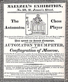 Von Kempelin’s son sold The Turk to Johann Nepomuk Mälzel, a Bavarian musician with an interest in automata. Mälzel refurbished The Turk and hosted a game with Napoleon I at Schönbrunn Palace in 1809. There are contradictory stories about the match. One, for example, suggests that Napoleon attempted an illegal move more than once, and The Turk responded by knocking all the pieces off the board with a sweep of his arm. Napoleon was said to have been amused.