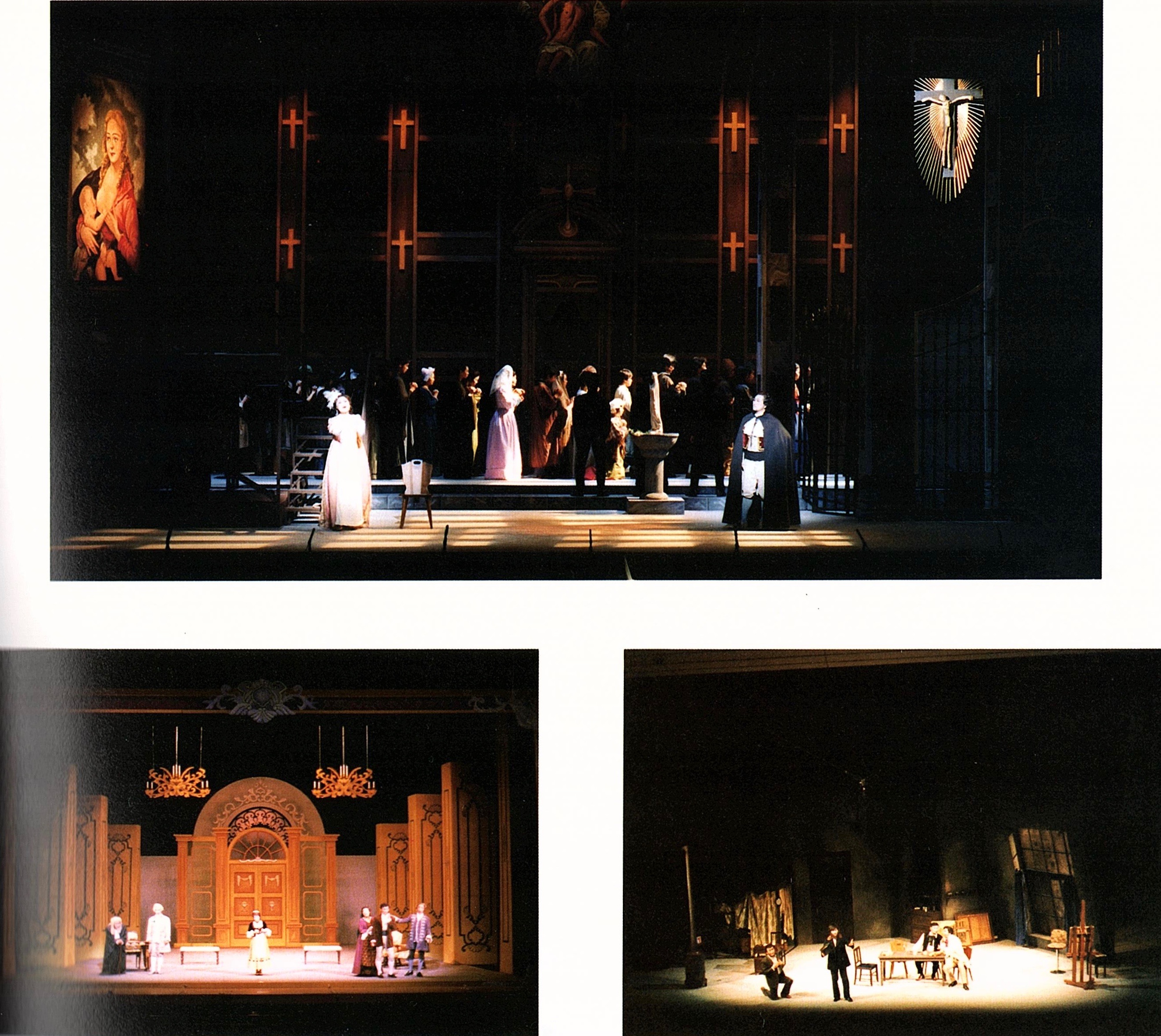 Puccini’s Tosca. Below it at left, Mozart’s The Marriage of Figaro; to its right, Puccini’s La Bohème. Set designs by Senkichi Uchiyama.