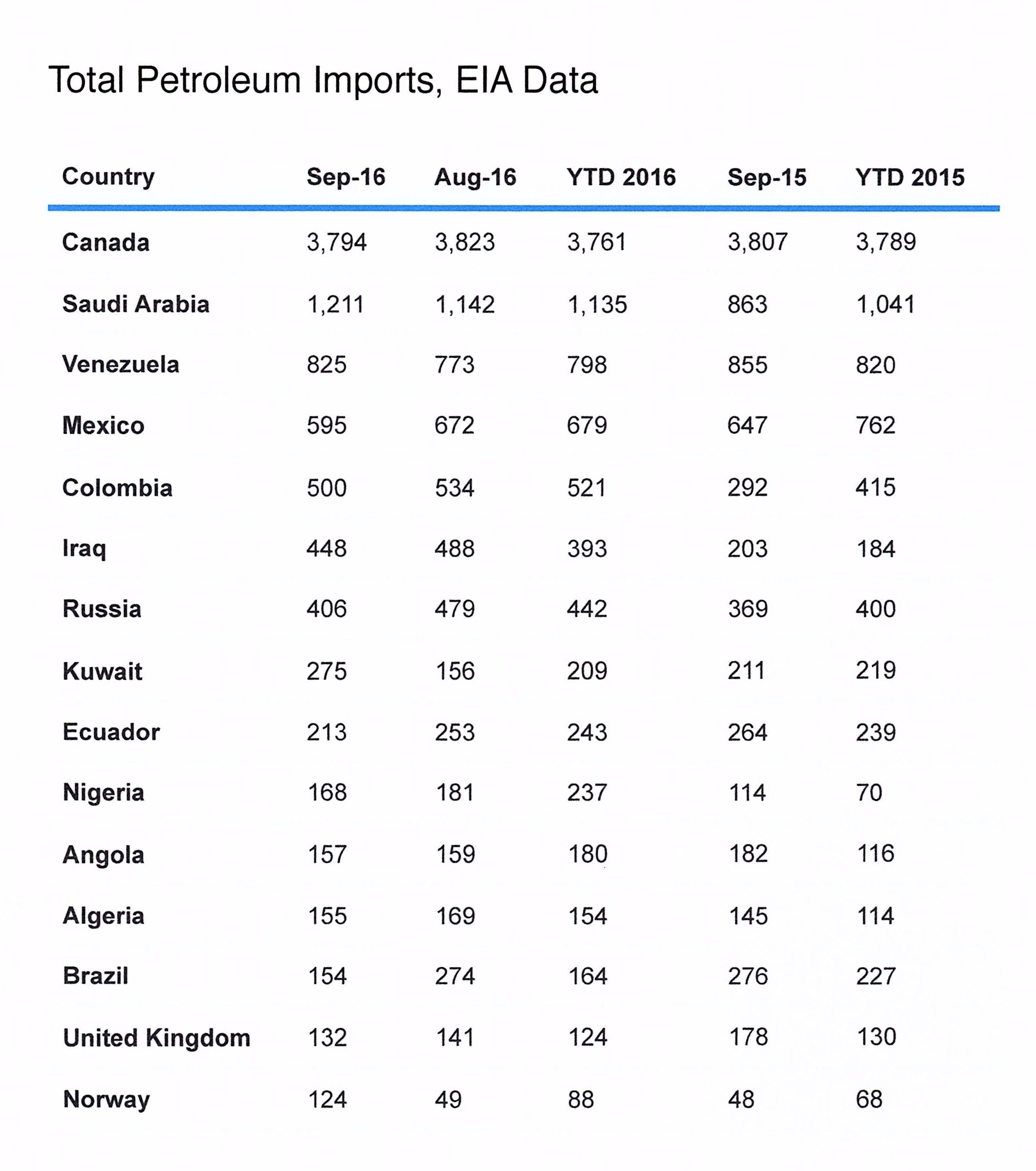 The EIA data for September 2016 are typical. Canada accounted for almost 42 percent of U.S. petroleum imports. In previous years, Mexico and Saudi Arabia have tied for second, though the latter has pulled away into a solid second ranking, with Venezuela moving up.
