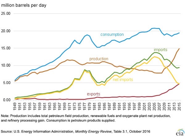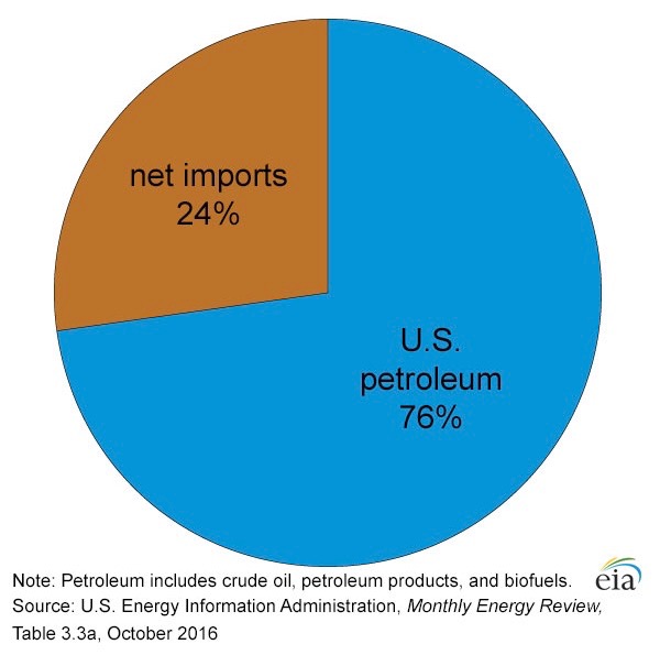 In 2015, the U.S. imported an averaged 4.7 million barrels of petroleum per day; this, of its 19.5 MMb/d consumption. This 24 percent is the lowest level of imports since 1970. In fact, the U.S. is a net exporter (i.e., exports minus imports) of petroleum liquids and refined products. The U.S. also exports crude oil, 92 percent of which went to Canadian refineries.