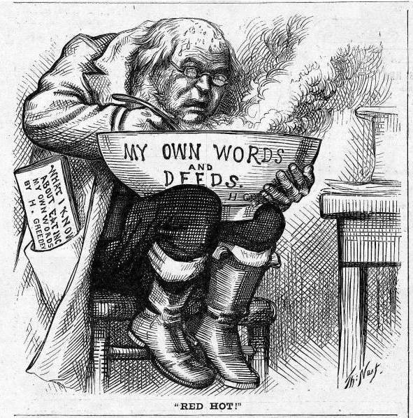 The campaign prior to all this was marked with the Republicans accusing Greeley of treason and of supporting the Ku Klux Klan. Political cartoonist Thomas Nast contributed vicious anti-Greeley cartoons despite Greeley being recognized as an able social reformer.