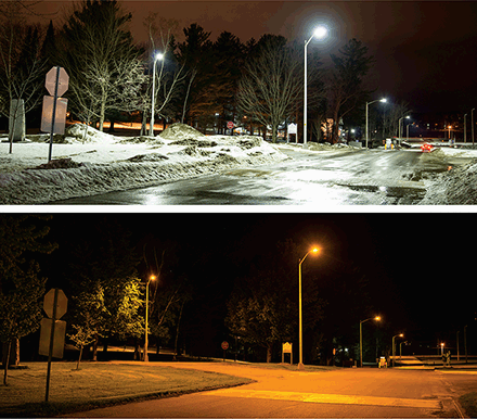 Above, standard L.E.D. street lighting. Below, more telescope-friendly L.E.D. lighting. Images from Science, January 20, 2017.