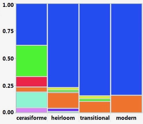 Above, allele distributions of MHO. Below, allele distributions associated with geranylacetone. Cerasiforme is the wild, cherry, tomato. Transitional tomatoes, as the name suggests, are those genetically between heirloom and modern. Both MHO and geranylacetone are volatiles.