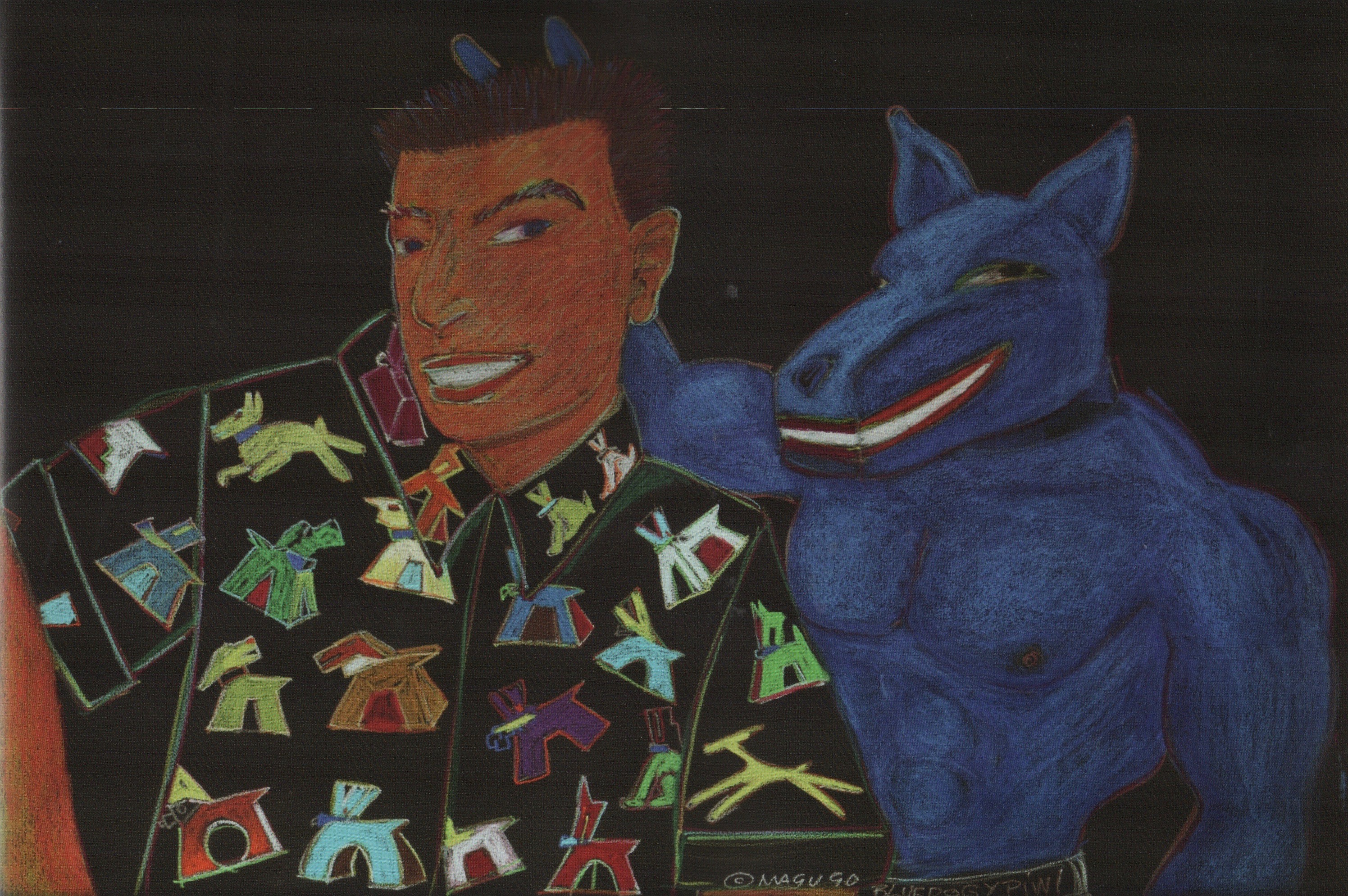 Blue Dog and Piwi, by Gilbert “Magu” Luján, pastel on paper, 1990. This and the following from Papel Chicano Dos.