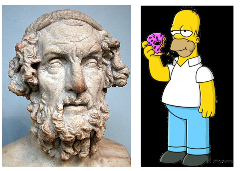 At left, Homer, semi-legendary Greek author of the Illiad and the Odyssey. At right, Homer Jay Simpson, according to TV Guide, “the second greatest cartoon character” besting all but Bugs Bunny.