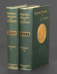 Personal Memoirs of U.S. Grant, by Ulysses S. Grant, Charles L. Webster & Co., two volumes, 1885–1886. Image from Manhattan Rare Books.