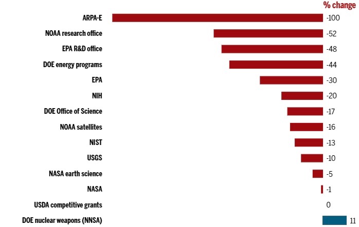 The current president’s ignorance of science is described in Science magazine’s March 16, 2017, article “A Grim Budget Day for U.S. Science.” Seemingly, everything but nuclear weapons takes a hit; one, the Advanced Research Projects Agency–Energy, is eliminated completely.