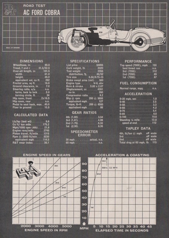 A lot of ground was covered very quickly in running to 7200 through the four-speed Borg Warner, even with the prototype suffering from an overly large gap between third and top. The Cobra sprang from 0 to 60 mph in 4.2 seconds and posted 13.8 in the quarter at a speed of 112 mph, “equal to the best efforts of drag-strip-tuned Corvettes,” according to R&T.