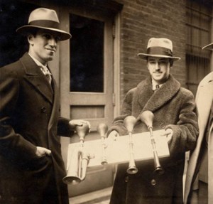 George Gershwin, left, and percussionist James Rosenberg hold four Parisian taxi horns used in performances of American in Paris, March 1 and 2, 1929. Image from The Gershwin Initiative, University of Michigan. For more on this UofM program, see “Shall We Dance? And Walk the Dog?