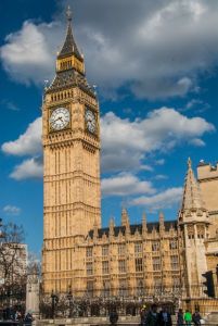 Big Ben, the largest of five bells in the Clock Tower of the Houses of Parliament, London, England. Image from Britain Express. For a historical view see “Lofty London—1930.” Check out Eadwig’s sonic example.