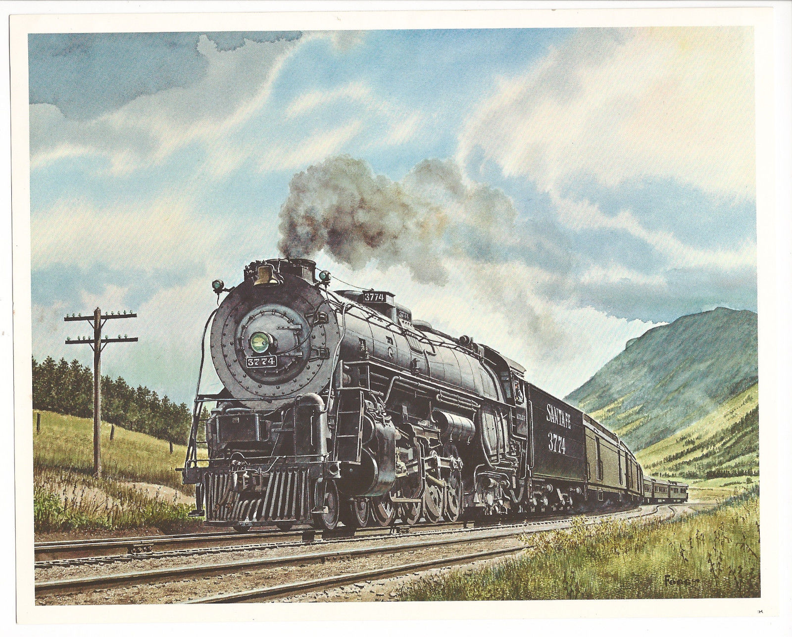Atchinson, Topeka and Santa Fe #3774, 1938 Baldwin 4-8-4 Northern. Watercolor by Howard Fogg from the-wanderling.com. Also, baldwinloco12 has collected fine examples of these sounds.
