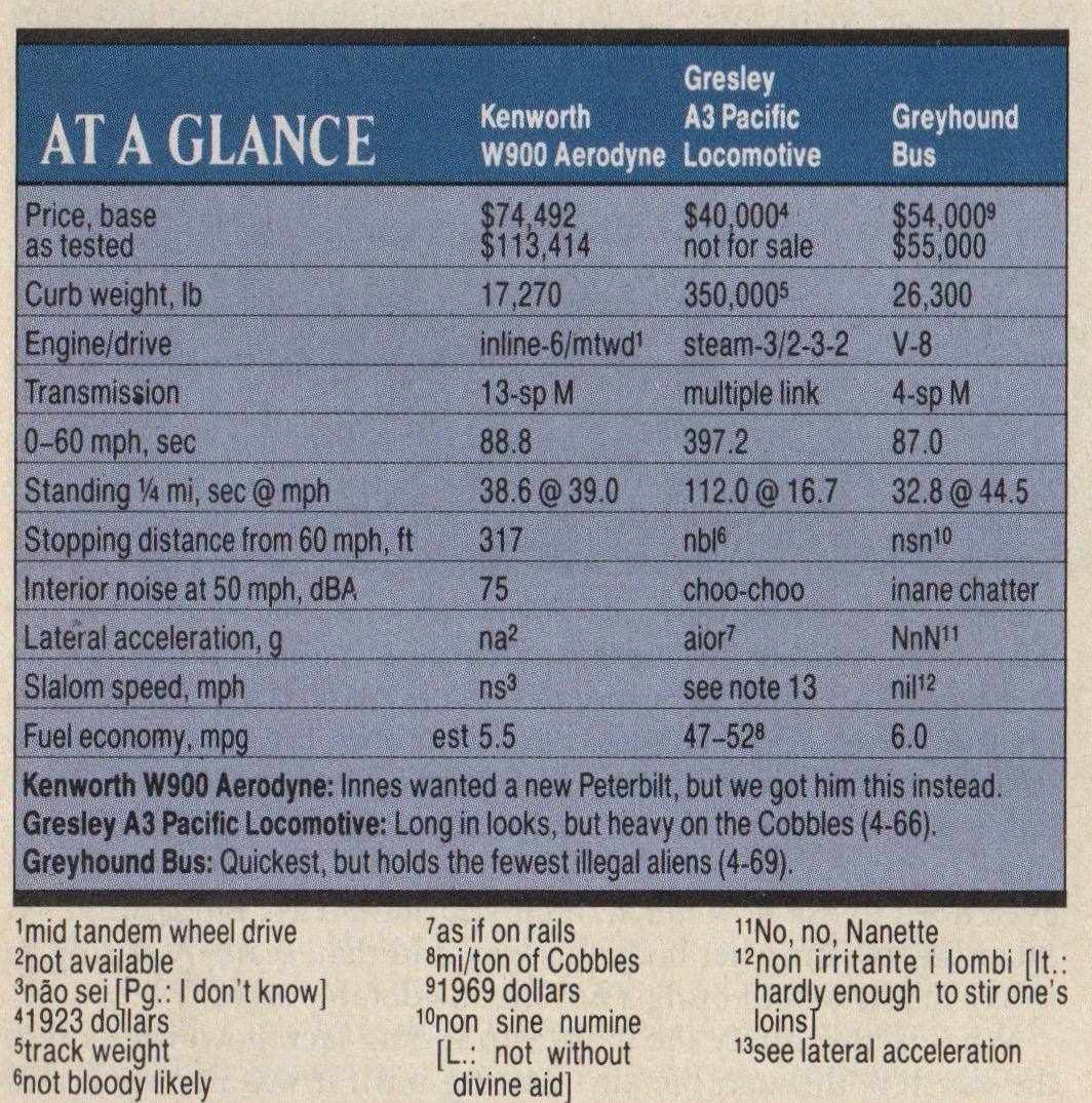 The R&T At a Glance box compared the Kenworth with its only two other vehicles tested to date that were in any sense comparable: a Greyhound bus and Gresley A3 Pacific locomotive.