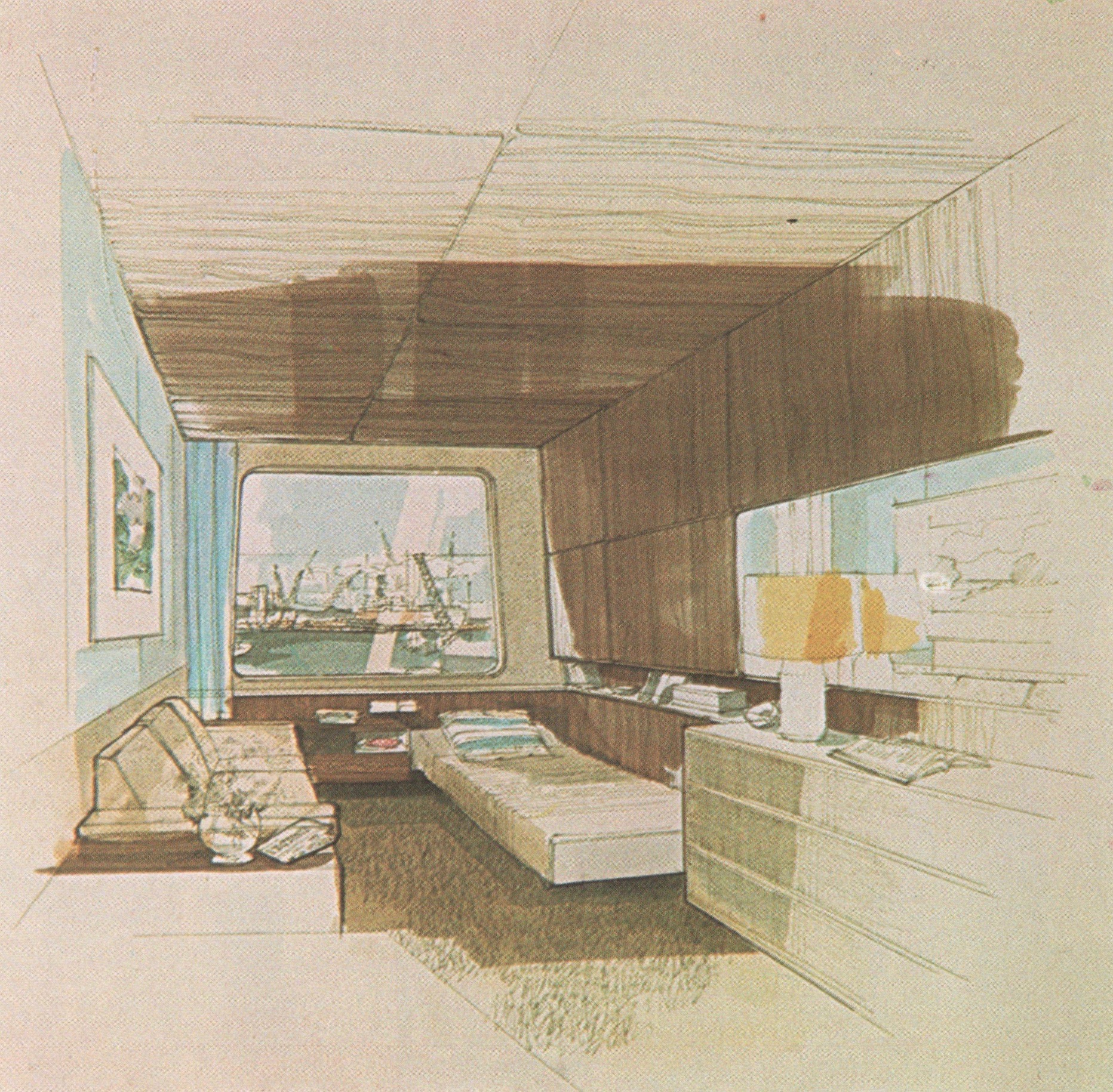 Two counterexamples of wonderful interior design: Above, Compaignie de l’Esthetique Industrielle, Raymond Loewy. A stateroom on a Parisian bâteau converted into a hotel. Below, House on Massachusetts coast, 1948. Hugh Stubbins, architect. Drawing by Charles Forberg.