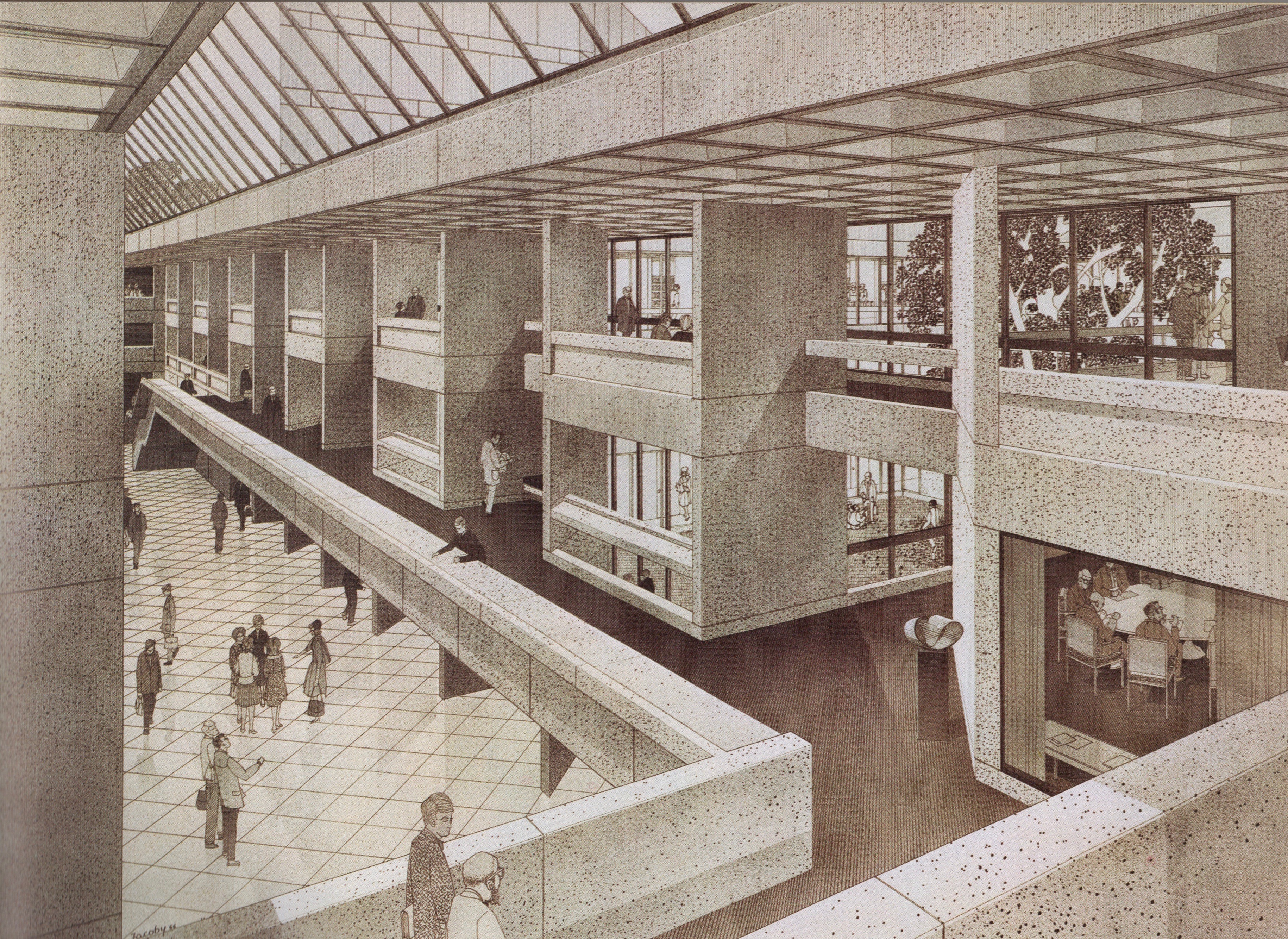 Brown University Earth Sciences and Mathematics Building,1967. I.M. Pei and partners, architects. Rendering by Helmut Jacoby.