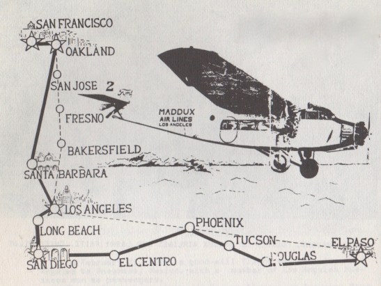 According to D.D. Hatfield’s Los Angeles Aeronautics, Maddux Air Lines began operation on July 21, 1927, just two months after Charles Lindbergh’s New York/Paris solo. The inaugural flight of the Maddux Ford 4-AT carried 12 passengers. It traveled from a dirt strip, Inglewood Site (now within LAX), to another one near San Diego’s Dutch Flat (where Lindbergh had picked up his Spirit of St. Louis from the Ryan Airlines plant, the site adjacent to today’s San Diego International Airport/Lindbergh Field).