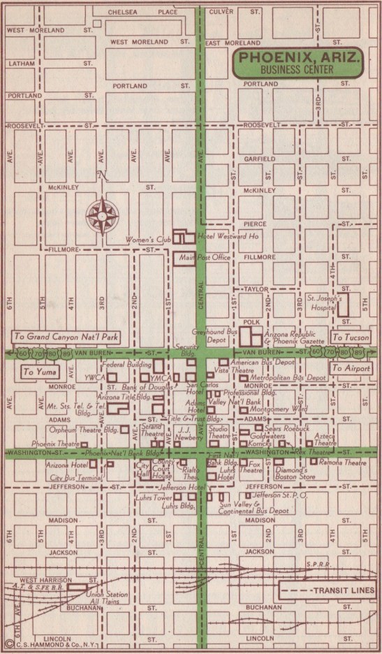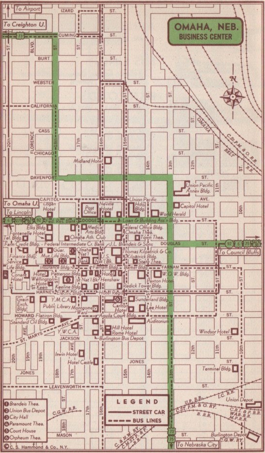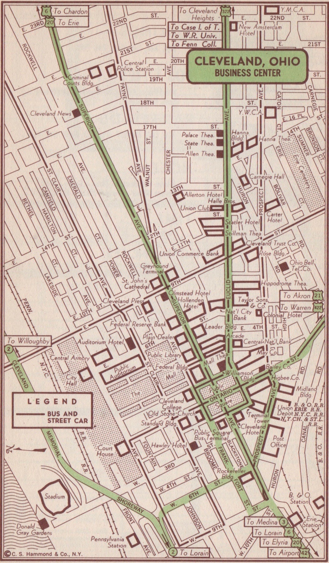 Even apart from cityhenge research, I learned a lot from the old Hammond’s. For instance, my native Cleveland, Ohio, was served in 1951 by the Blue Ridge, Burlington-American, Edwards Lakes to Sea and Greyhound Bus Lines. Or I could have traveled on one of seven airlines (AAL, CAP, EAL, NWA, TCA, TWA or UAL) or eight railroads (B&O, CV, Erie, N&SS, NYC, NYC&StL, Penn and RT). Among the hotel hot tips were the Statler (now the Statler Arms apartments) and Wade Park Manor (now Judson Manor, a retirement community).
