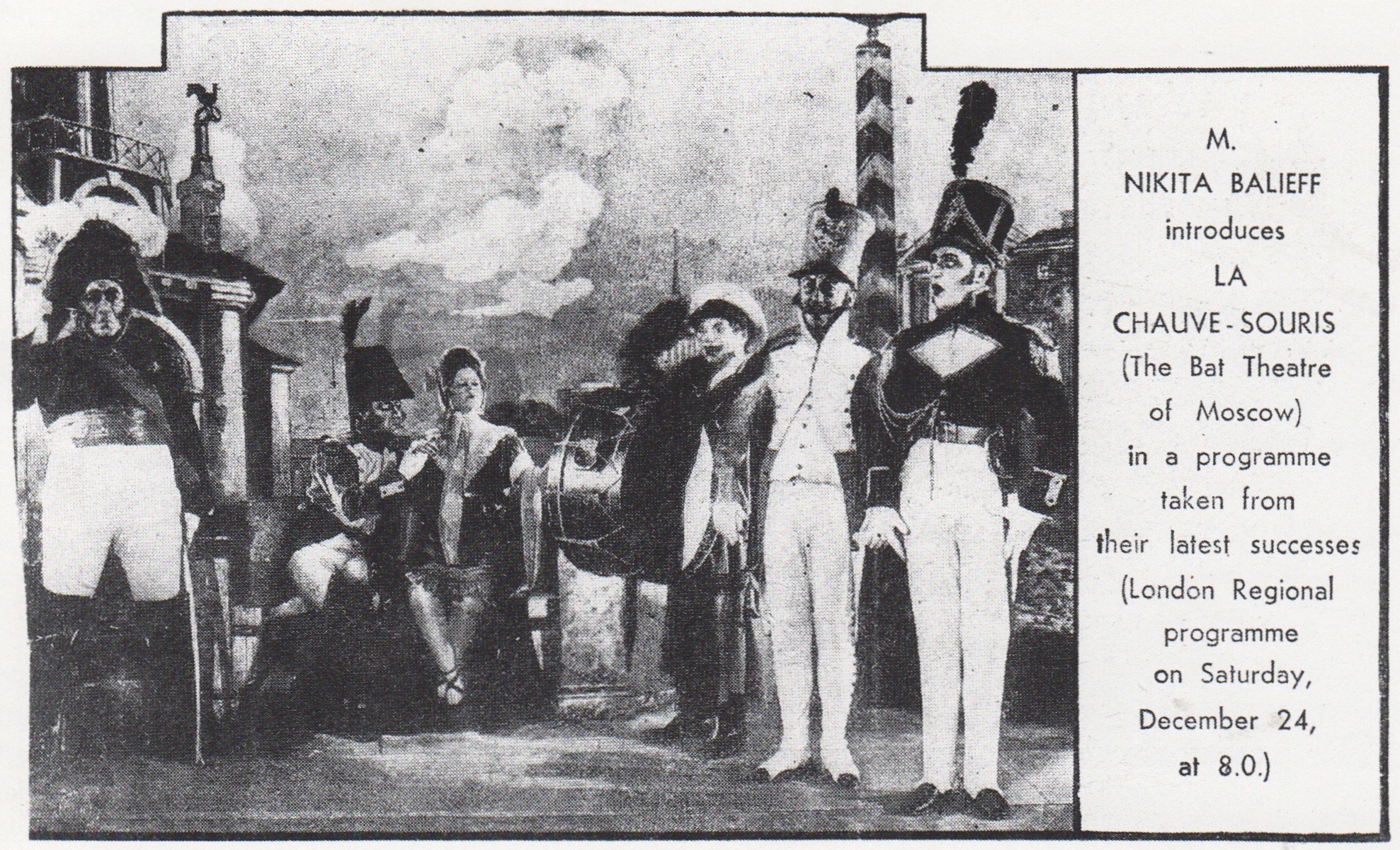 Nikita Balieff’s La Chauve-Souris theater company was based in Paris, and also visited London and the United States. The Sunday Times, London, December 11, 1932, wrote of Balieff’s production, “He was wittier than ever at the Cambridge, and everything he said had an air of spontaneity—although I am certain it is as carefully rehearsed as the rest of the programme.”