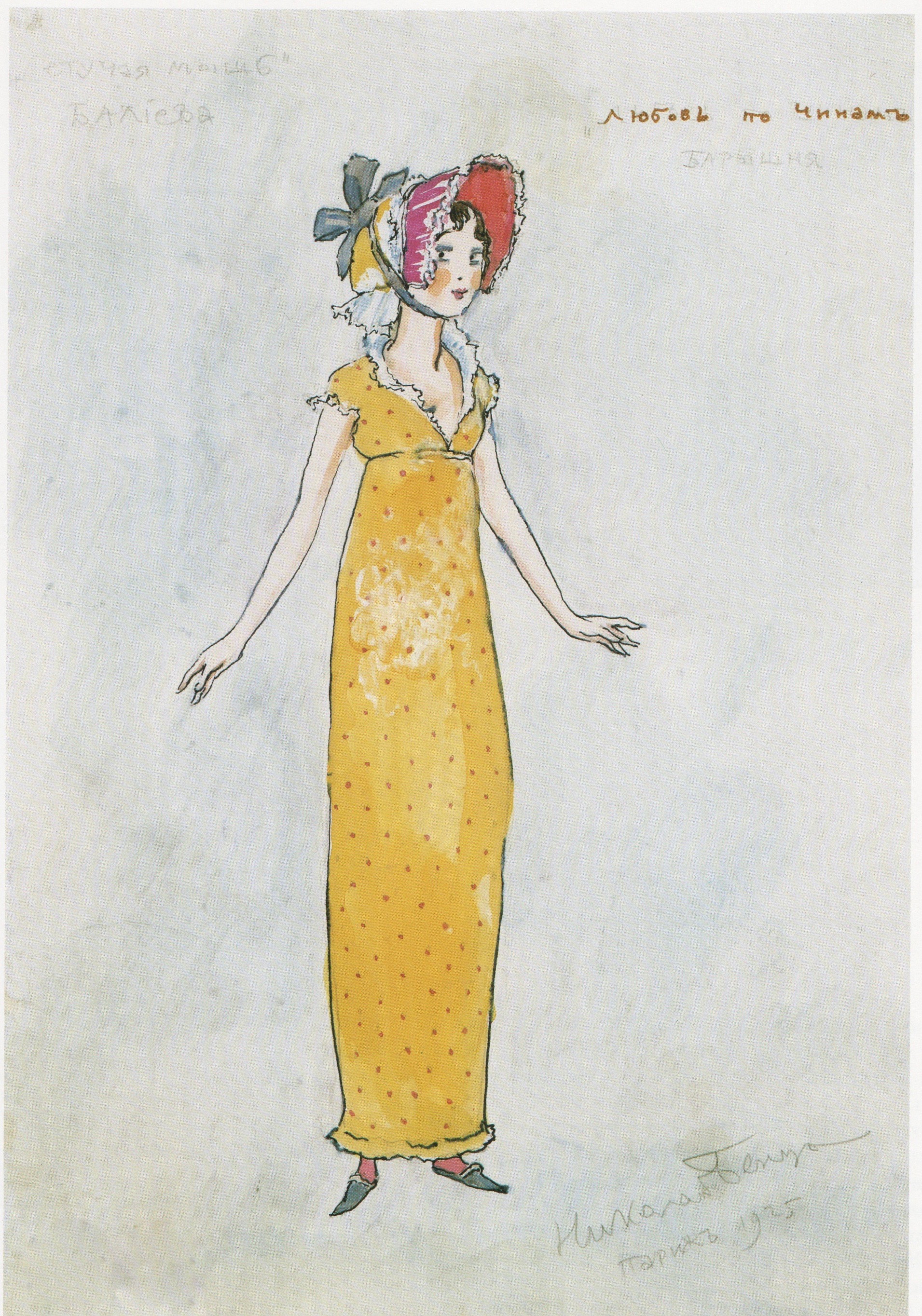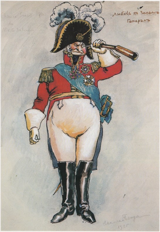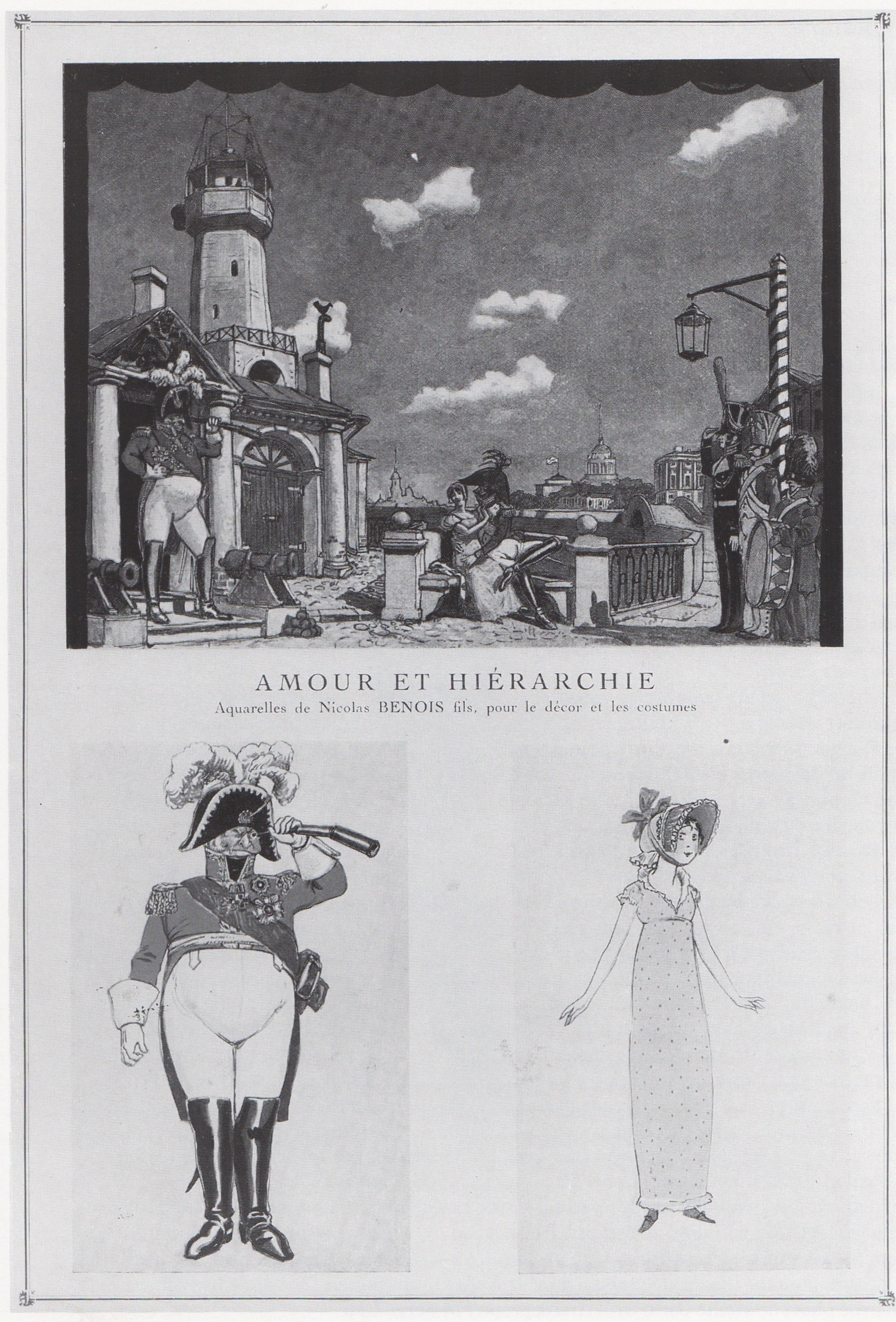 Amour et Hiérarchie, a satiric revue by Alexis Archangelsky, was produced by Nicolas Benois in Paris in 1924. The title’s rendering in English, Love in the Ranks, gives away the plot: This buffoonery of old Saint Petersburg involves a charming young woman, a drummer boy, a sergeant major, a lieutenant, a colonel and a general. She’s sitting on a bench outside the barracks, and the first five vie for her affections. Finally, the general arrives. And guess who strolls off with the lady on his arm?