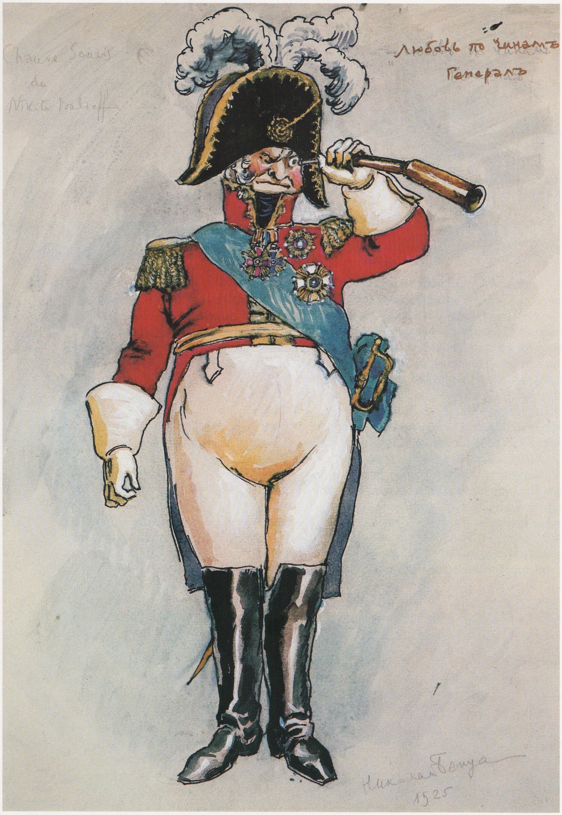 Above, design for the General’s costume; below, design for the Young Woman’s costume, both in Amour et Hiérarchie, by Nicolas Benois, 1925.