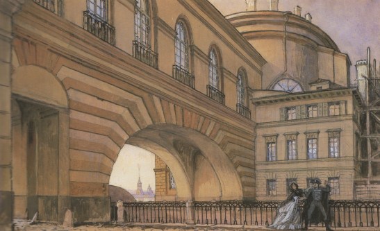 The Queen of Spades, Act III, Scene 2: On the quay of the Neva, by Alexandre Benois, 1919. Liza tries unsuccessfully to dissuade Herman from gambling.