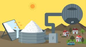 Molten Salt Stockpiling the Sun’s Rays. During the heat of the day, energy from 10,300 solar panels melts a salt into a 1000-degree Fahrenheit liquid that retains its heat. Through heat exchange, this liquid runs steam-generated turbines producing electricity—even for hours after the sun goes down.