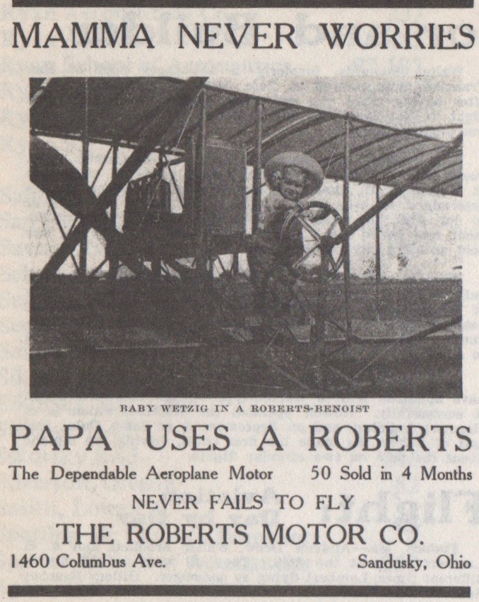 THE ROBERTS Motor Company of Sandusky, Ohio, manufactured advanced aircraft engines in the early part of the last century. Indeed, according to the Smithsonian National Air and Space Museum, more Roberts engines were said to be built in that era than those of Curtiss and Hall-Scott combined.