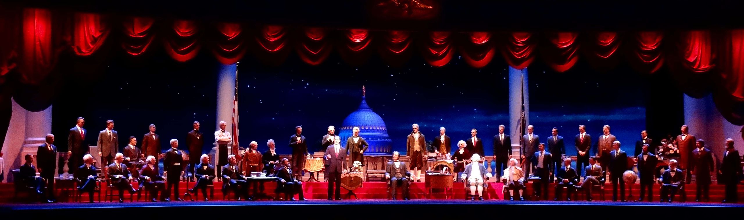 An enhanced Lincoln made its debut at Disneyland in 1967 and Disney World’s Hall of Presidents in 1971. As the 2009-2017 version of the attraction evolved, all 44 presidents were represented animatronically, including a speech by Barack Obama. The Hall of Presidents closed on January 17, 2017, for refurbishment and inclusion of an animatronic Donald Trump.