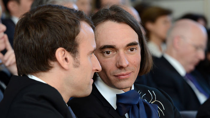 Emmanuel Macron, left, is, according to Villani, “a president who believes science is part of global politics.” Villani is wearing his usual silk ascot and spider brooch. Image from Science, June 23, 2017.