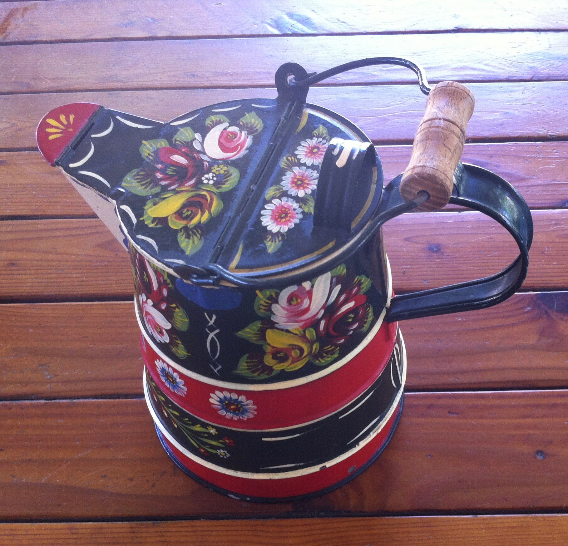 This handpainted kettle is a souvenir from the Canal Museum, Stoke Bruerne, Northhamptonshire. Narrowboat culture is known for its folk art.