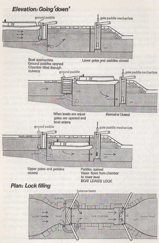 Balance beams at either end of the lock operate gates determining the level of the water within it, high or low. Culverts actuated by paddles divert water from the high level to the lock.
