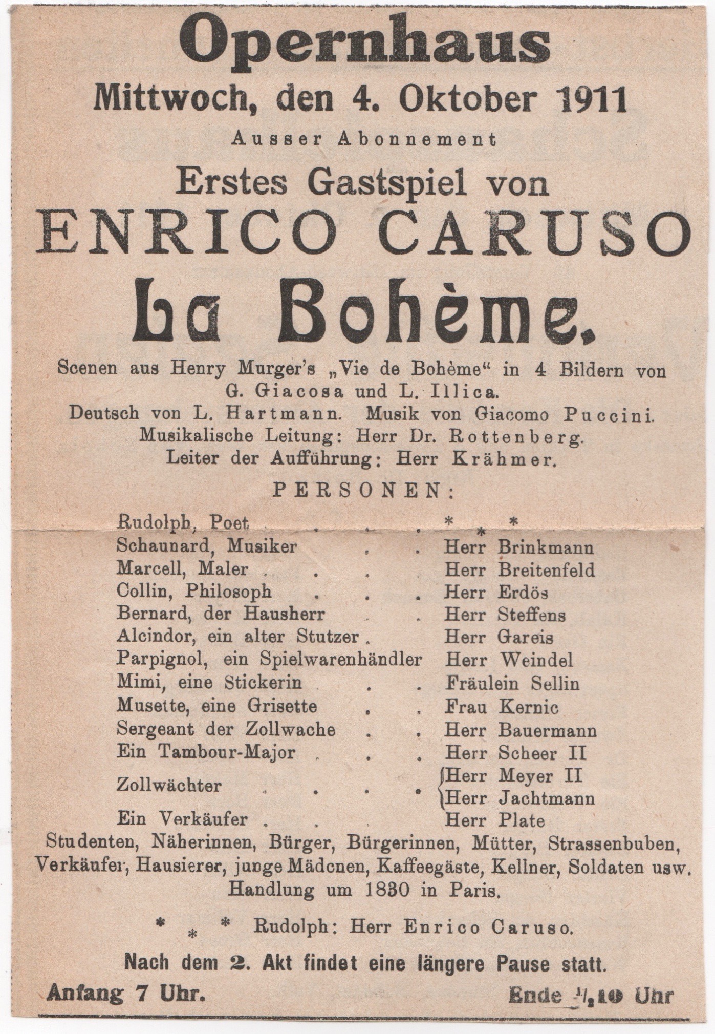 My Operaglass book’s original owner collected newspaper clippings of two of Annesley’s 151 operas: Puccini’s La Bohème was performed at an unidentified Opernhaus on October 4, 1911, with no less than Enrico Caruso singing Rudolfo.