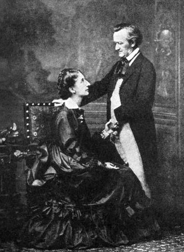 At right, Wilhelm Richard Wagner, 1813–1883, German composer, theater director, conductor. At left, Cosima Liszt Von Bülow Wagner, 1837–1930, second wife of Richard Wagner, 1870 to his death in 1883.