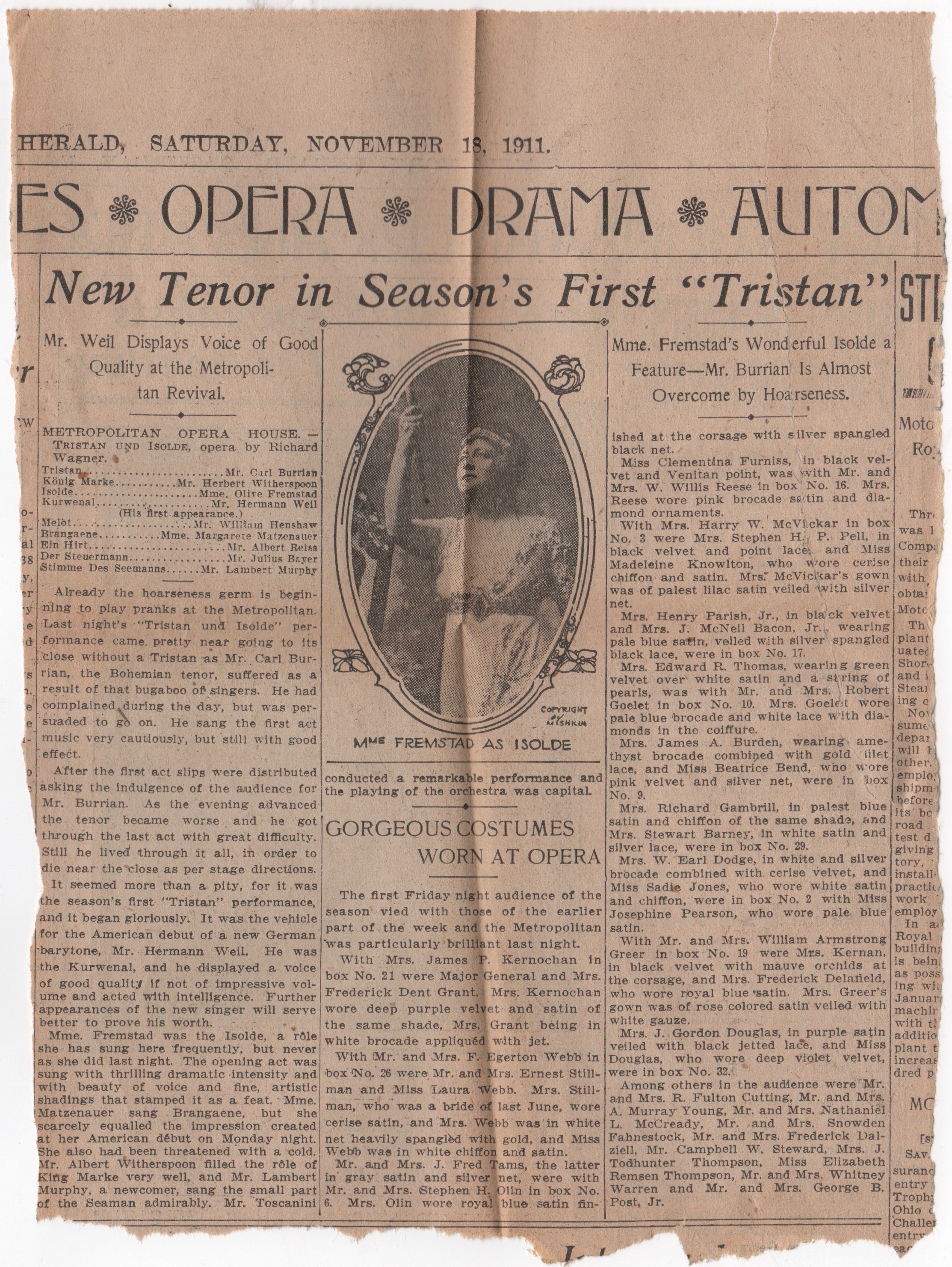 Then a month later, a second clipping describes Wagner’s Tristan und Isolde performed at the Metropolitan Opera House in New York City on November 17, 1911.