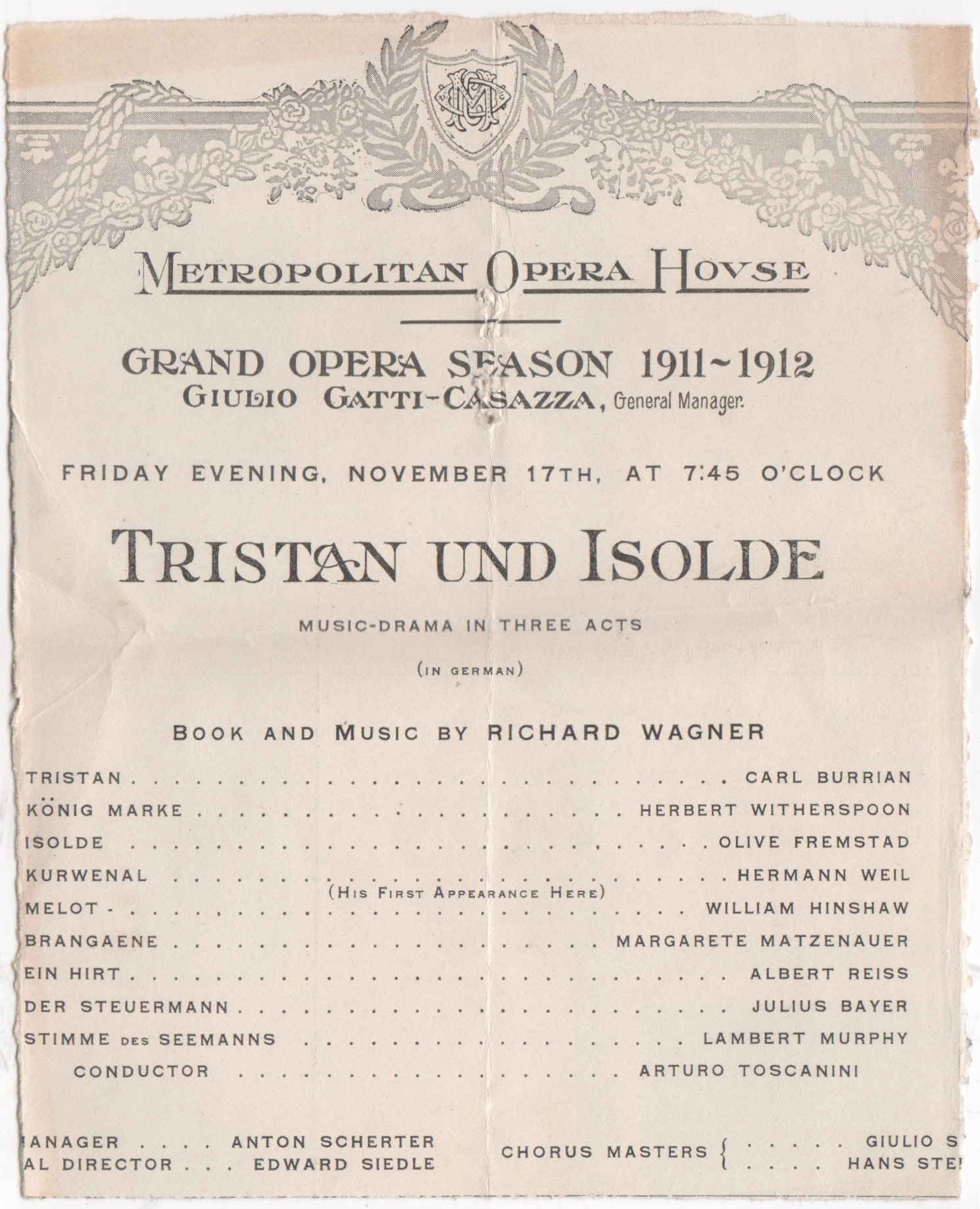 The Wagner opera was reviewed in the New York Herald, November 18, 1911: Carl Burrian’s Tristan “Displays Voice of Good Quality,” though “Almost Overcome by Hoarseness.” Mme. Olive Fremstad is a “Wonderful Isolde.” “Mr. Toscanini conducted a remarkable performance and the playing of the orchestra was capital.”